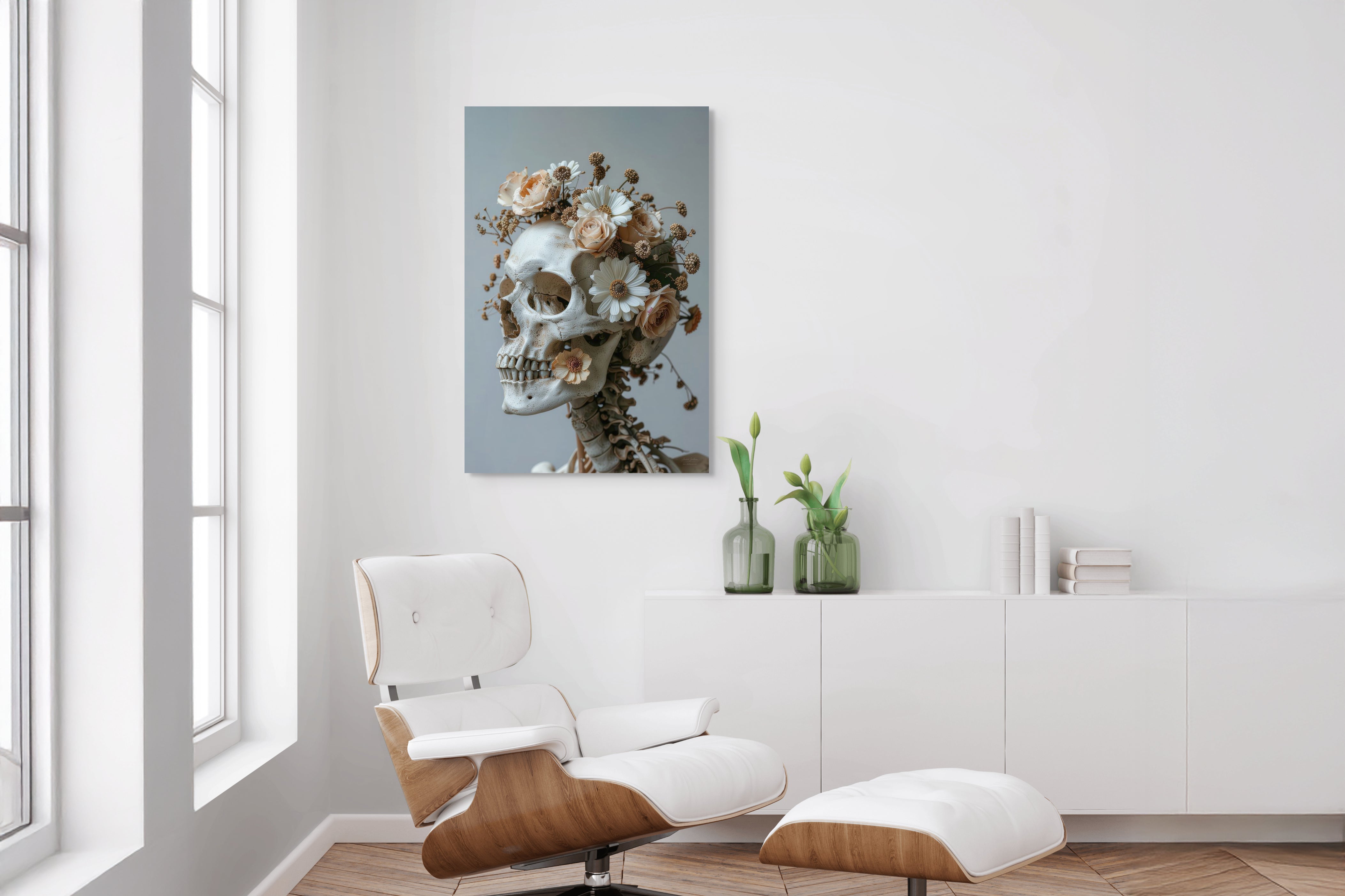 Bloemen en skulls versmelten tot uitgesproken fotokunst met een gelaagde, poëtische betekenis.